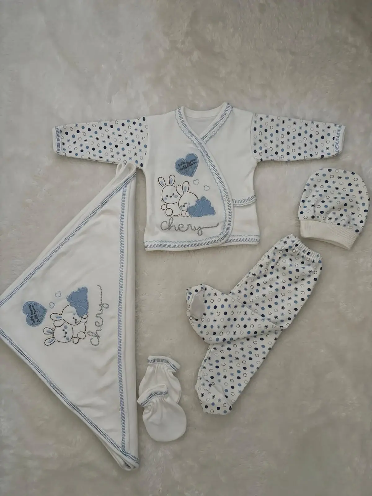 Bu 11’li Bombino Tavşan Set, içinde body, zıbın, alt, eldiven, şapka, önlük, havlu, atlet gibi tamamen ihtiyaç odaklı parçalar barındırır. Mavi tonlu detayları, sevimli tavşan nakışı ve puantiyeli desenleri sayesinde hem fotoğraf çekimlerinde hem günlük giyimde çok hoş bir görünüm sunar.