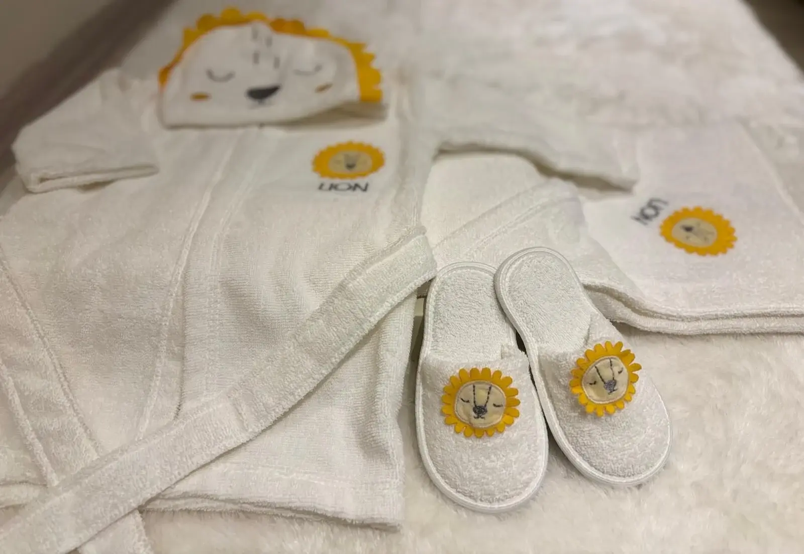 Bu sette; kapüşonlu bornoz, omuz havlusu, el havlusu ve minik terlikler bir arada sunulduğundan ihtiyaç duyulan tüm parçalar tek pakette geliyor. Kapüşondaki aslan figürü ise hem tatlı bir görünüm hem de ekstra kuruluk sağlar. Ürün yumuşak, dayanıklı ve uzun süre formunu koruyan kaliteli havlu kumaştan üretilmiştir.