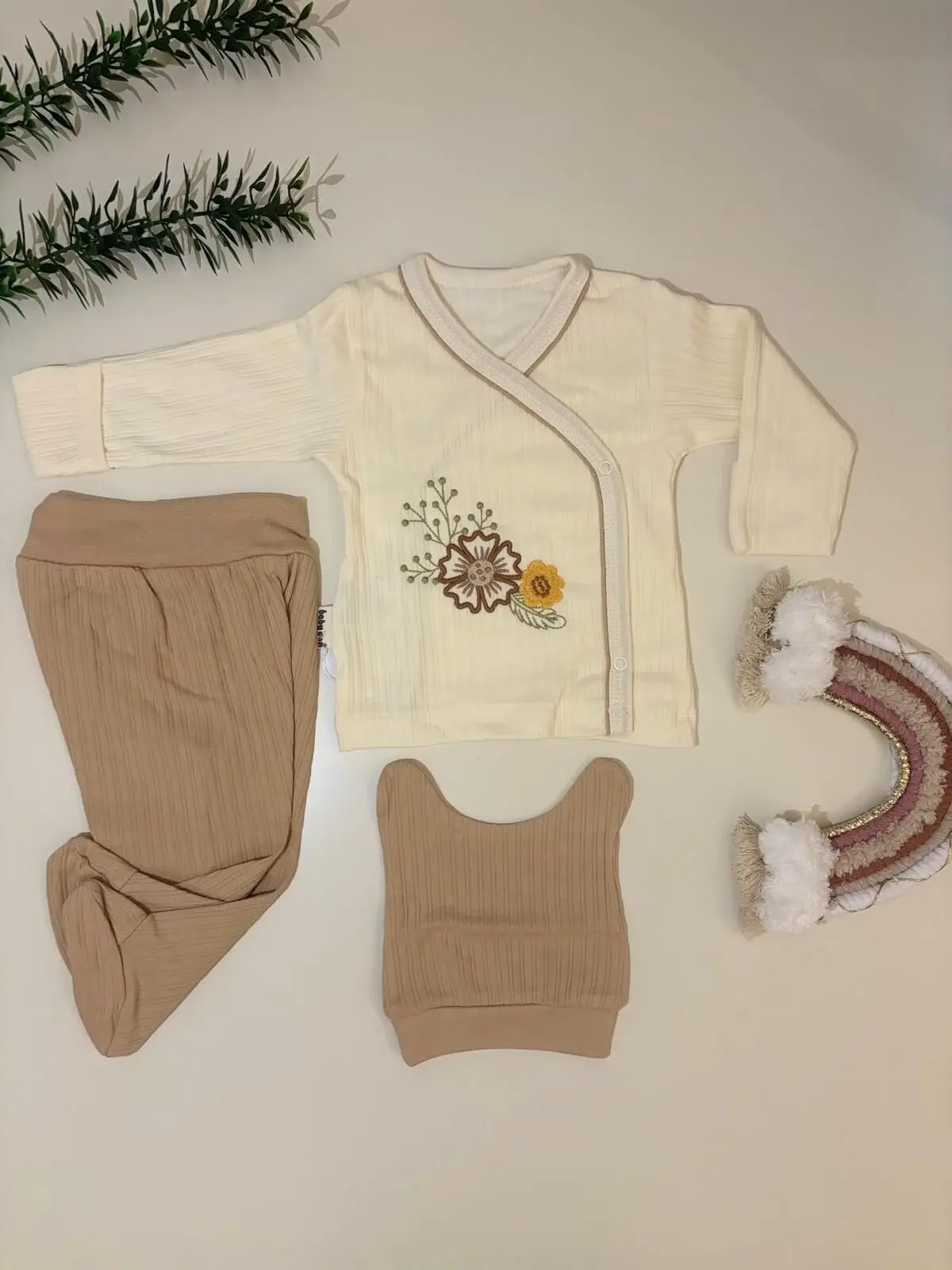 Çiçek Nakışlı 3’Lü Zıbın Takımı – Doğal Tonlarda Zarafet ve Yumuşacık Konfor