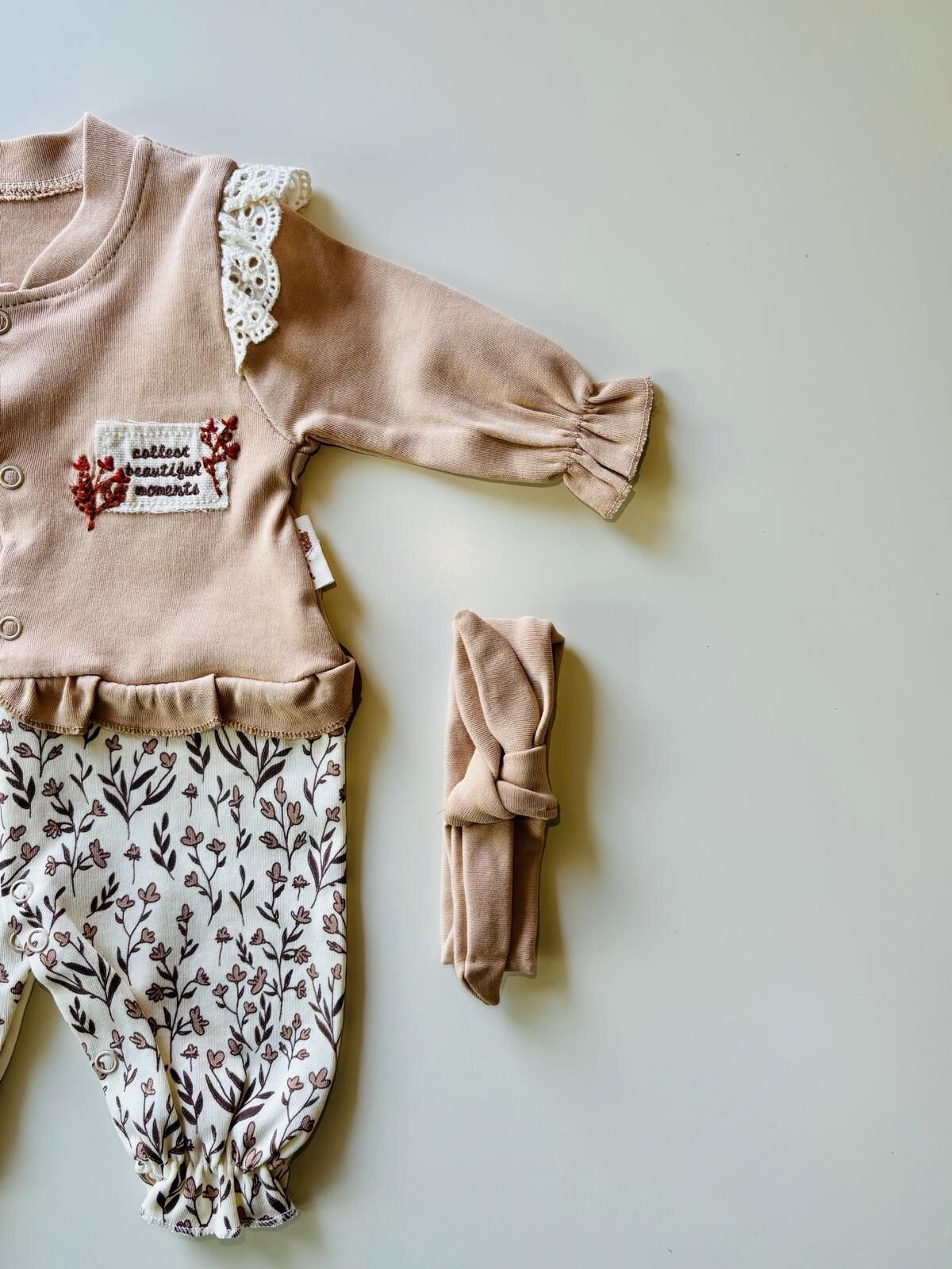 Çiçek Nakışlı Bandanalı Takım, bebeklerin hassas ciltlerine uygun yumuşak kumaşı, zarif omuz dantel detayları ve çiçek desenli alt parçasıyla hem konforu hem de şıklığı bir araya getiriyor. Annelerin sıkça merak ettiği “Günlük kullanımda rahat eder mi, hareketlerini kısıtlar mı, bandana bebeğime uygun olur mu?” sorularının cevabı: Evet, çünkü Çiçek Nakışlı Bandanalı Takım esnek yapısı sayesinde bebeğin gün boyu özgürce hareket etmesini sağlar ve yumuşak bandanası rahatsızlık vermez. Üst kısmındaki minik fırfırlar ve pastel tonların uyumu, fotoğraf çekimleri ve misafirlikler için şık bir görünüm oluşturur. Yıkandıkça formunu koruyan dayanıklı kumaşı sayesinde uzun süre kullanılabilen Çiçek Nakışlı Bandanalı Takım, hem hediye hem de günlük kombin tercihi için ideal bir settir.