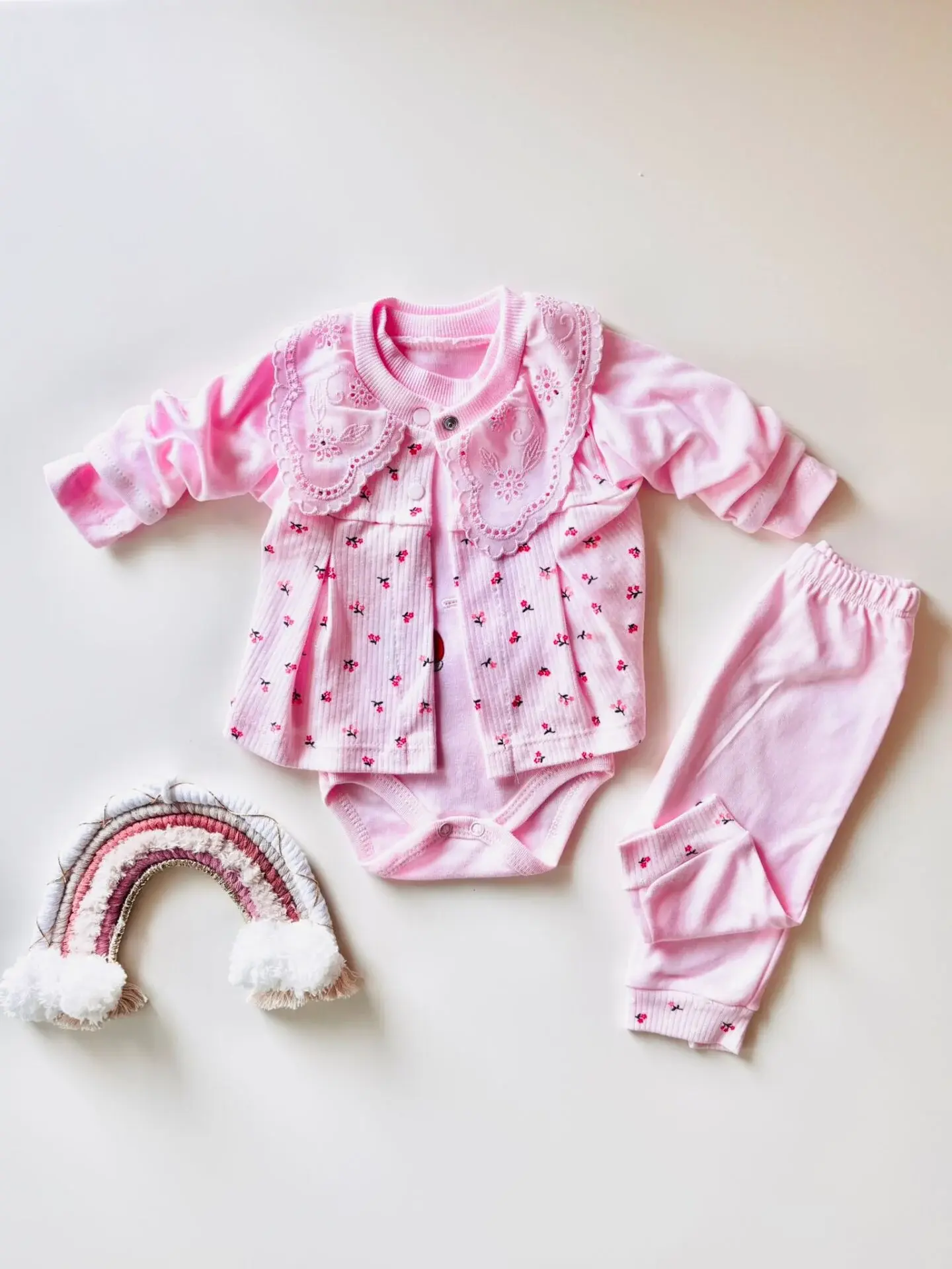 Çiçekli Yaka Detaylı 3'lü Takım, hem günlük kullanımda hem de özel günlerde bebeğinize zarif bir görünüm sunan yumuşacık bir settir. Hassas ciltlere uygun pamuklu kumaşı sayesinde annelerin en çok sorduğu “Tüylenme yapar mı, terletir mi, bebeğimin cildini rahatsız eder mi?” gibi soruların cevabı: Hayır, çünkü Çiçekli Yaka Detaylı 3'lü Takım nefes alan ve yumuşak dokulu bir yapıya sahiptir. Üst kısmındaki fırfırlı çiçekli yaka detayı, alt parçanın rahat kesimi ve nakışlı bady tasarımı ile hem şık hem de kullanışlı bir kombin sunar. Günlük giyim, dış çekim, misafirlik veya hediye seçimi için ideal olan Çiçekli Yaka Detaylı 3'lü Takım, kolay giydirme çıtçıtları sayesinde ebeveynlere büyük kolaylık sağlar.
