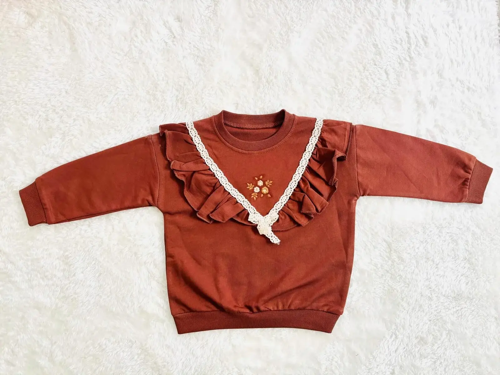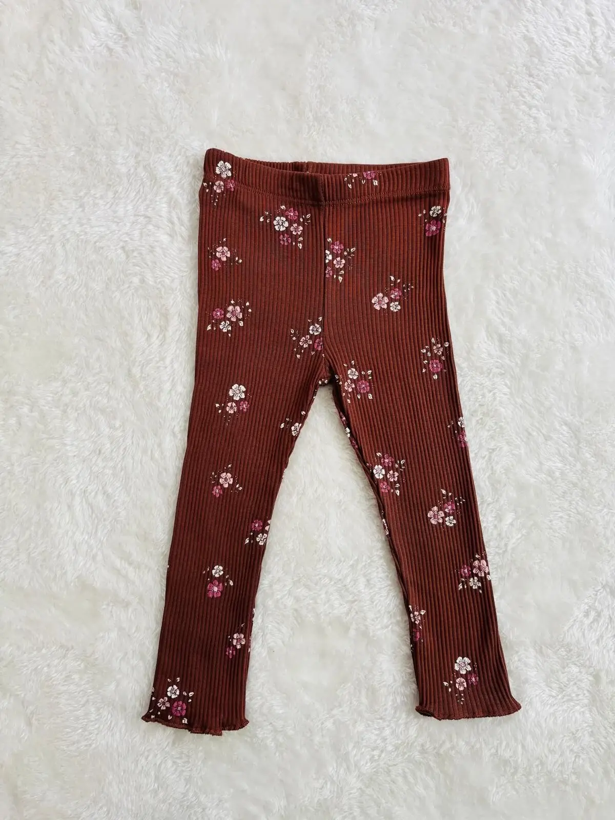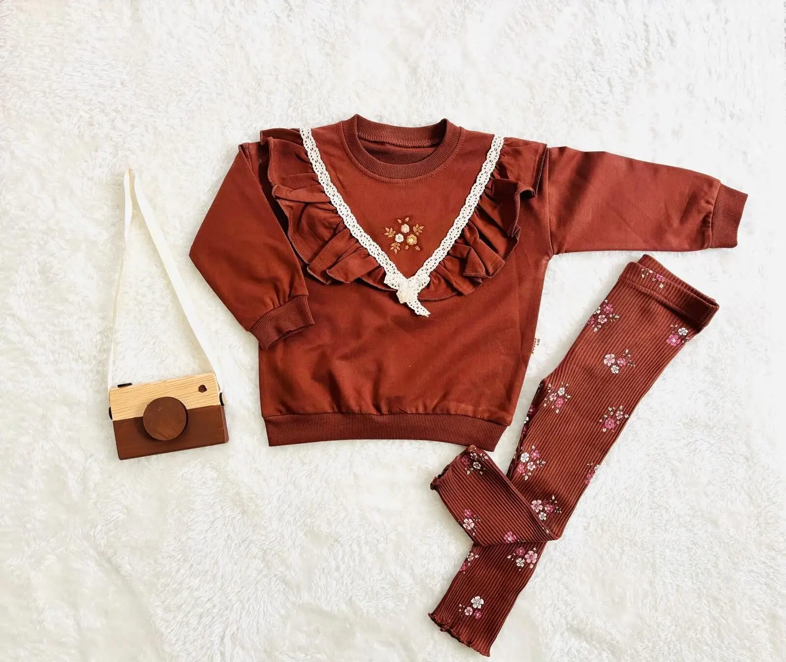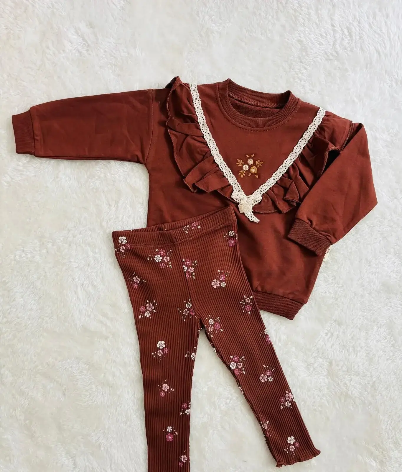 Dantel Fırfır Detaylı Kız Çocuk 2’li Takım – Çiçek Baskılı Ribana Tayt ve Sweatshirt