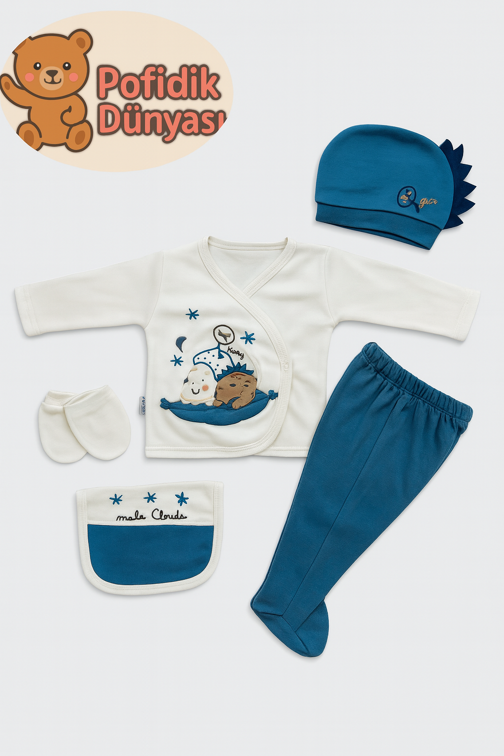 Erkek Bebek Dinazor Desenli 5’li Hastane Çıkışı Seti – Yenidoğan İçin Şık ve Konforlu