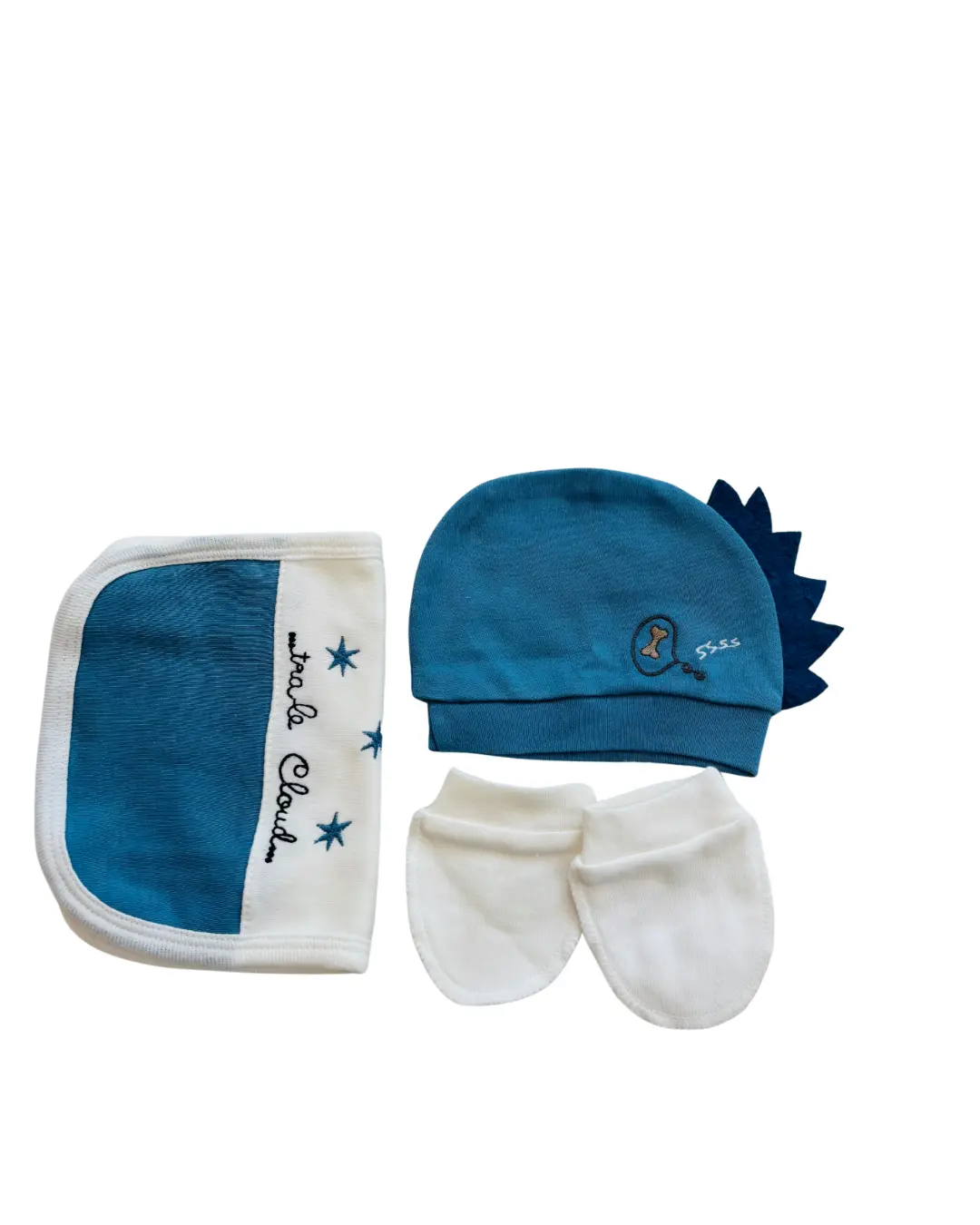 Erkek Bebek Dinazor Desenli 5’li Hastane Çıkışı Seti, bebeğinizin doğumdan itibaren ihtiyaç duyacağı temel parçaları bir arada sunarak ebeveynlere büyük kolaylık sağlar. %100 pamuklu ve nefes alabilen kumaşı sayesinde yenidoğan cildine dosttur, terletmez ve gün boyu konfor sağlar. Set içeriğinde zıbın, pantolon, şapka, eldiven ve üst parça bulunur.
