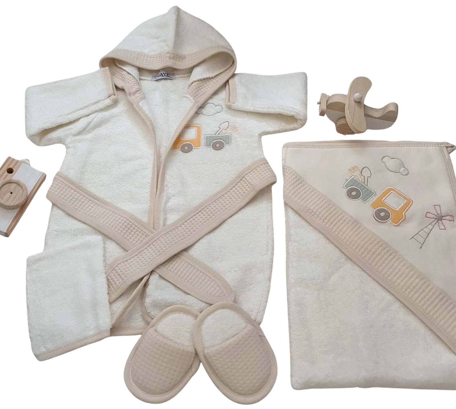 Bu Kamyonlu Bornoz Set, yüksek emici özelliğe sahip pamuksu havlu dokusuyla bebeğinizin hassas cildine nazikçe temas eder. İçerisindeki kapüşonlu bornoz, havlu, patik ve ek parçalar tamamen ihtiyaç odaklı hazırlanmıştır. Üzerindeki kamyon nakışı ise hem kız hem erkek bebeklere uygun, modern ve eğlenceli bir görünüm sunar.
