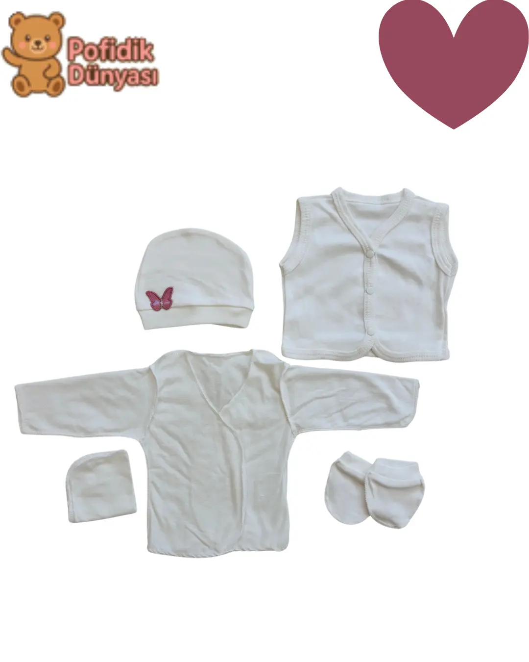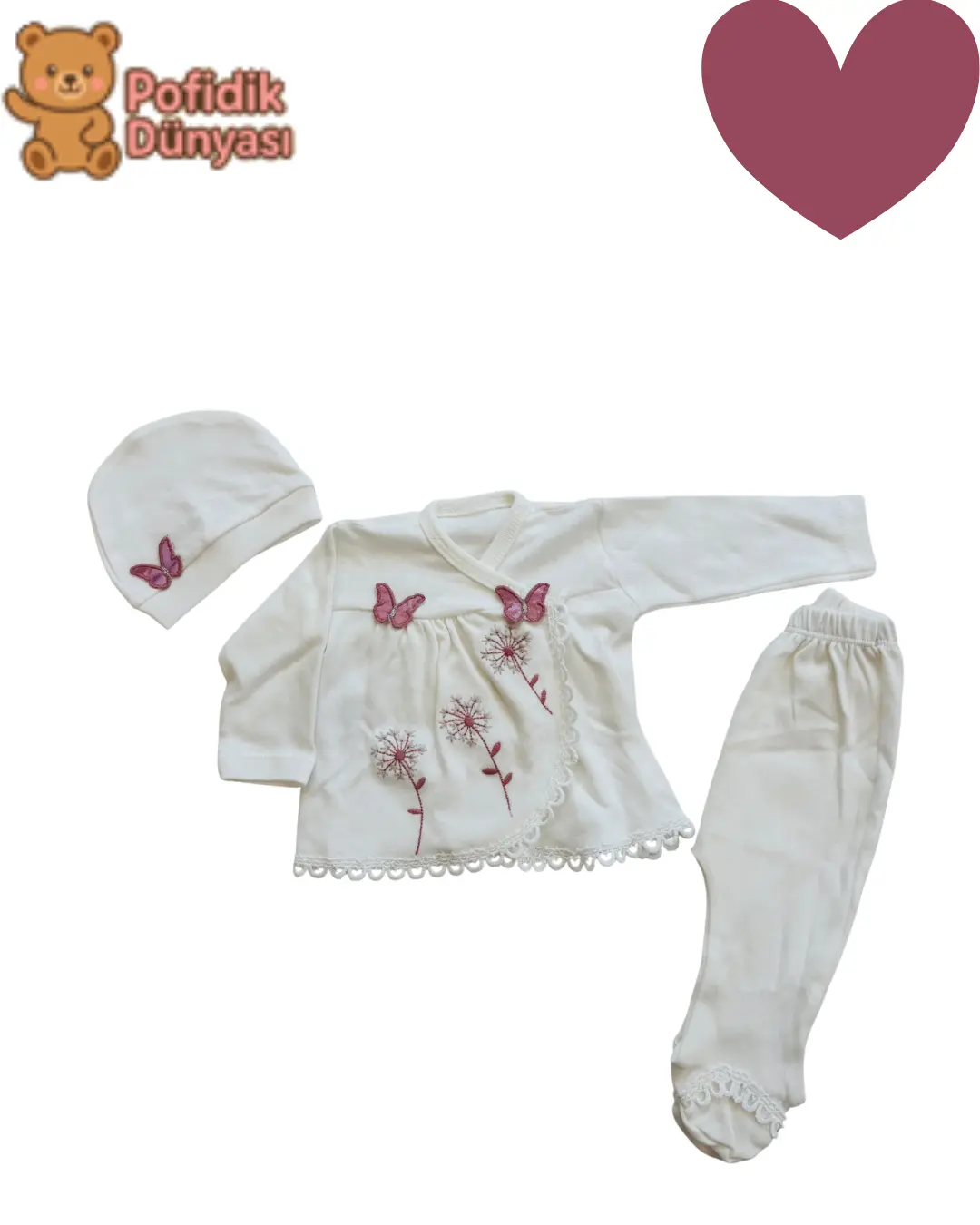 Kelebek Nakışlı 10’lu Yenidoğan Hastane Çıkışı Seti – Kız Bebek – %100 Pamuk ve AntialerjikYüksek emiciliğe sahip pamuk dokusu, bebeğinizin vücudunu nazikçe sarar ve terletmez. Şirin pembe kelebek nakışları görsel olarak zarif bir duruş sağlarken, düz beyaz zemin seti hem modern hem de sade kılar. Aynı zamanda hediye olarak da son derece şık ve kullanılabilir bir seçenektir.
