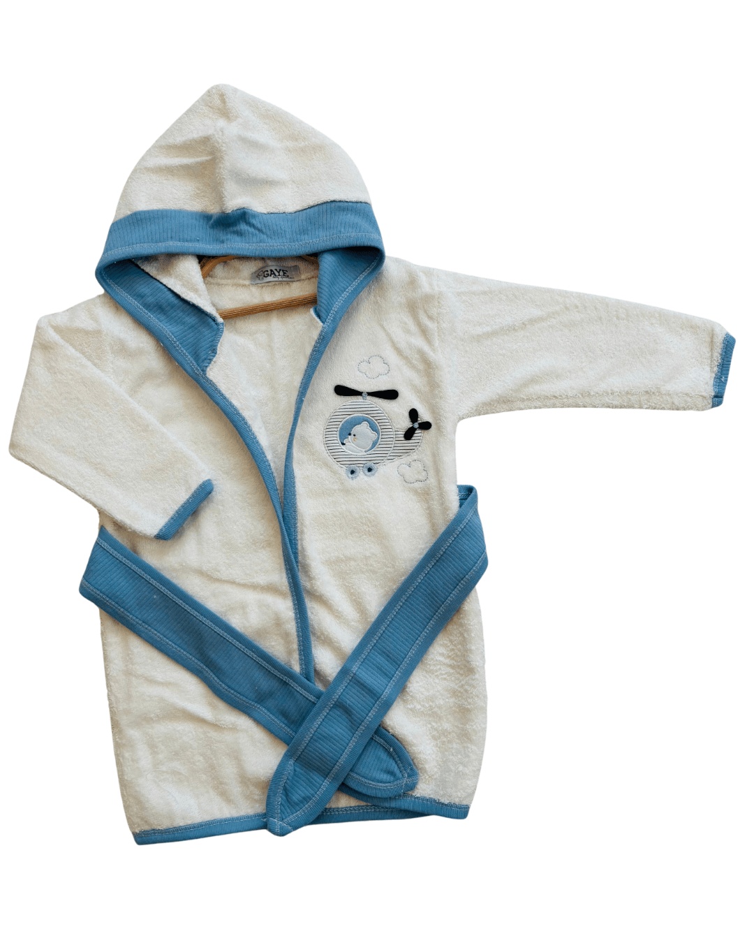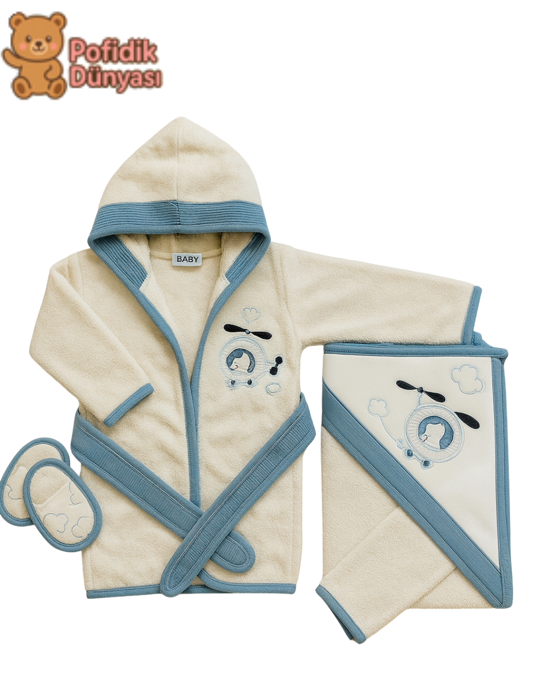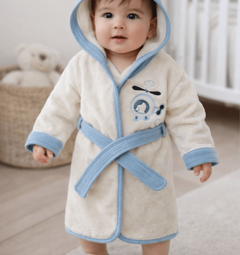 • Hem günlük kullanım hem de hediye için ideal. Mavi Helikopter Desenli Kapüşonlu Bebek Bornoz Seti – Yumuşacık, Şık