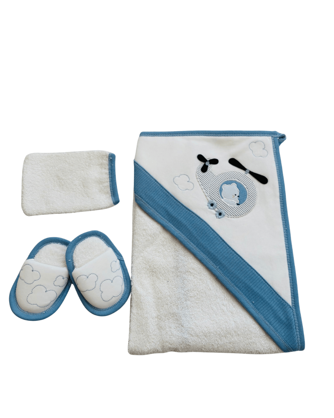 • Kapüşonlu tasarım – bebeğin başını sıcak tutar.Mavi Helikopter Desenli Kapüşonlu Bornoz Seti