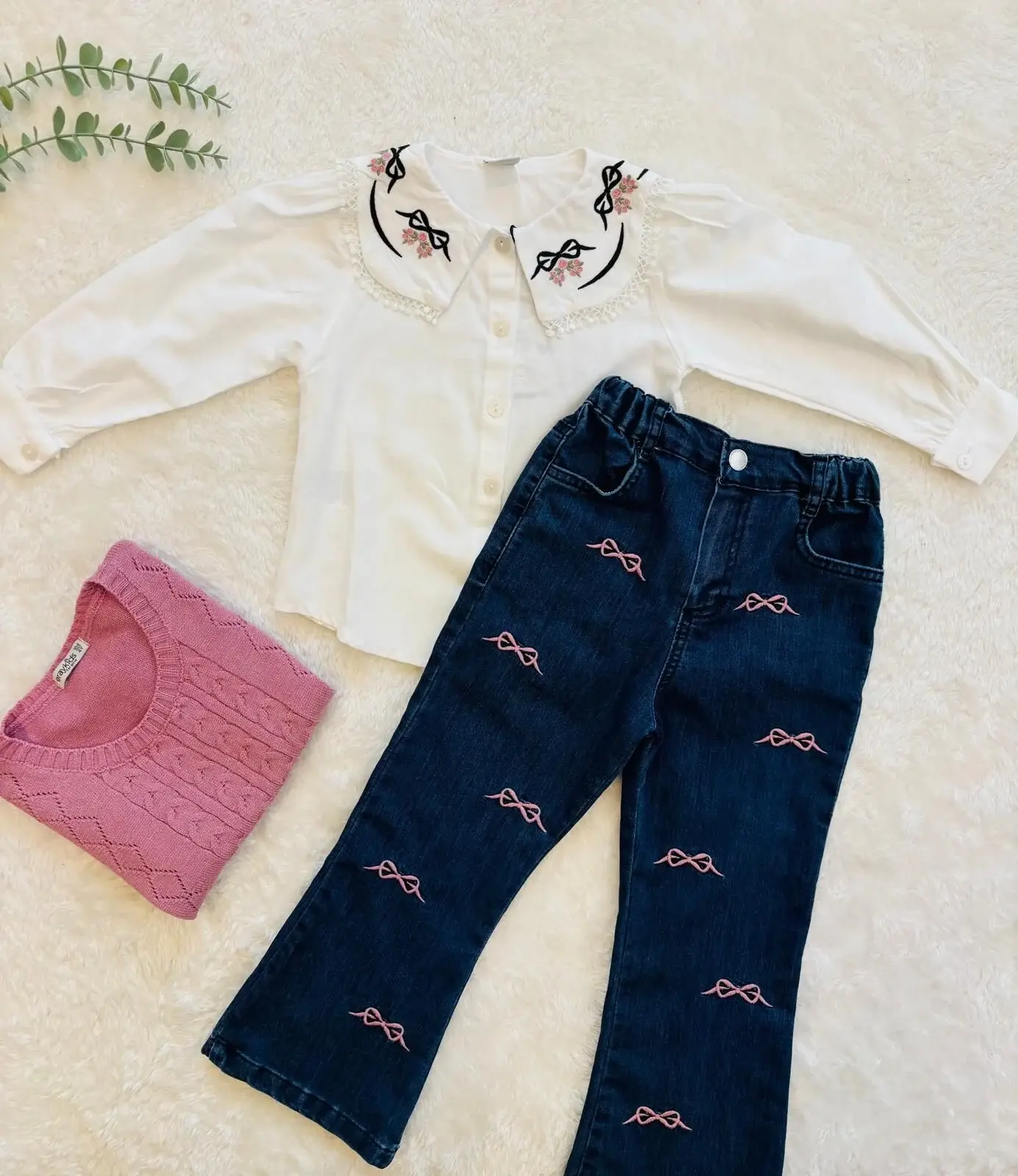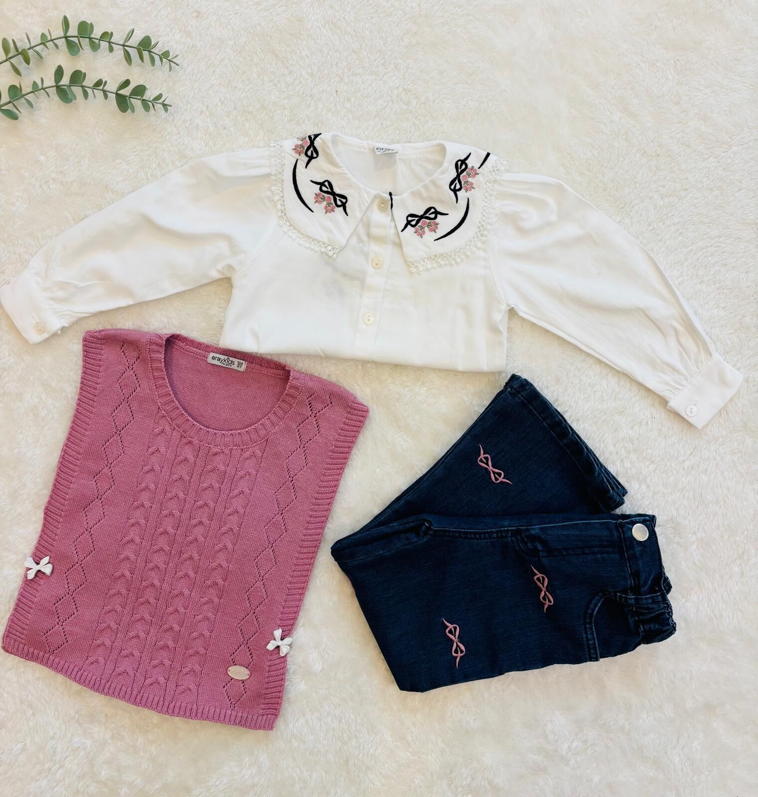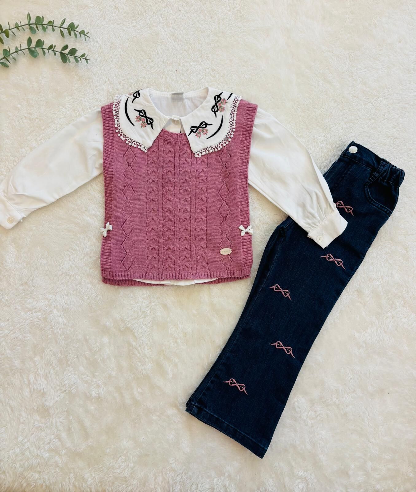 Nakış Detaylı Kız Çocuk 3’lü Takım – İşlemeli Yaka Bluz hem kalite hem de şıklığı bir arada sunarak minik prenseslerin dolabında fark yaratıyor. İşlemeli yakalı bluzunuz zarif bir görünüm oluştururken, pembe nakış süslemeli kot pantolon modern bir hava katıyor. Üzerine giyilebilen triko kazak ise soğuk havalarda sıcaklık ve stil sağlar. Nakış Detaylı Kız Çocuk 3’lü Takım pamuksu ve nefes alan kumaş yapısıyla bebeğinizin hassas tenine dosttur, gün boyu rahat ve özgür hareket olanağı sunar. Özel günlerde, okulda, dışarıda veya fotoğraf çekimlerinde mükemmel bir kombin oluşturur.Nakış Detaylı Kız Çocuk 3’lü Takım – İşlemeli Yaka Bluz