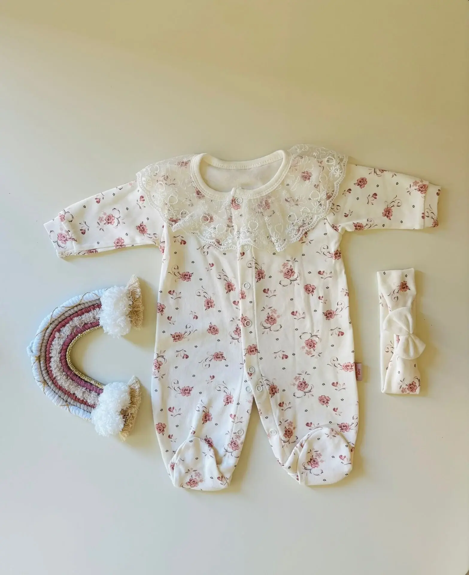Pamuş Kız Tulum 3-6-9 Ay Bebekler İçin Zarif, Yumuşacık ve Özel Dantel Detaylı Tasarım