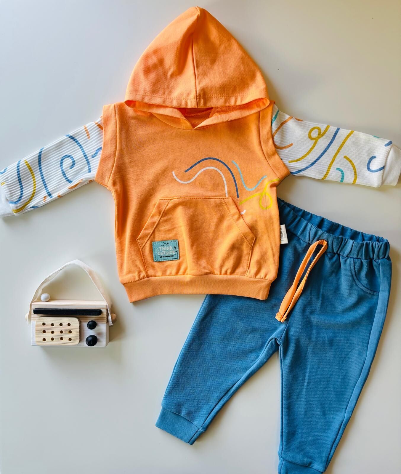 Süveterli Takım, turuncu kapüşonlu süveteri, rengârenk desenli uzun kollu üstü ve rahat kalıplı pantolonu ile hem spor hem de modern bir görünüm sunuyor. Annelerin sıkça merak ettiği “Kumaşı terletir mi, lastikli bel kısmı rahat mı, günlük kullanımda esneklik sağlar mı?” sorularının cevabı: Evet, çünkü Süveterli Takım nefes alan pamuklu dokusu, yumuşak iç yüzeyi ve esnek pantolon yapısıyla bebeğin gün boyu konforunu destekler. Hem dış mekân gezilerinde hem de ev içi oyun saatlerinde kullanıma uygundur. Kapüşonlu süveter tasarımı rüzgâra karşı koruma sağlarken, sportif detayları sete dinamik bir hava katar. Çocukların hareket özgürlüğünü kısıtlamayan Süveterli Takım, şık görünümü ve dayanıklı kumaşıyla ebeveynlerin güvenle tercih edeceği bir settir.