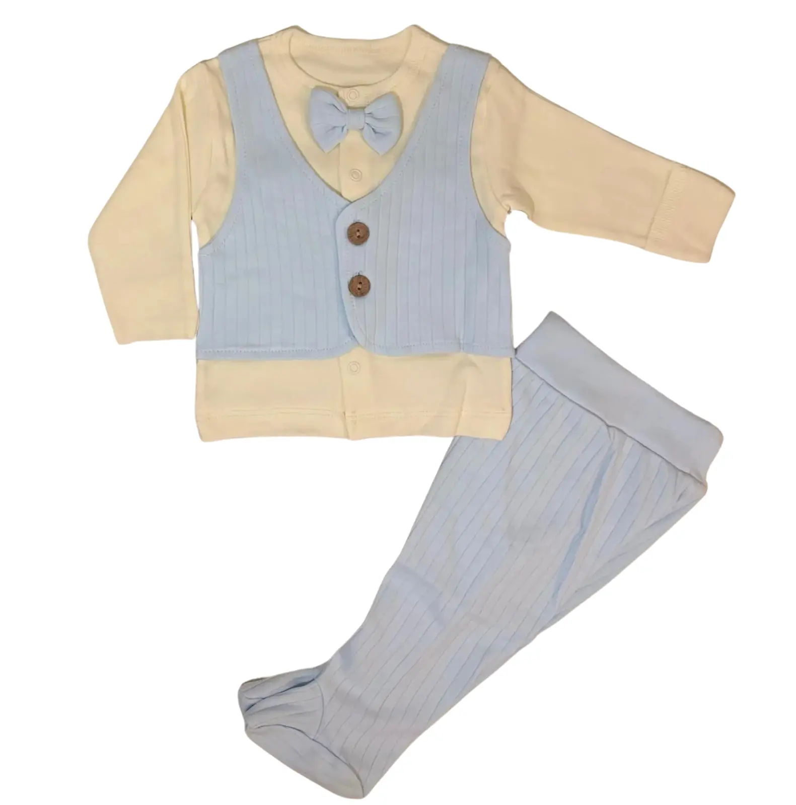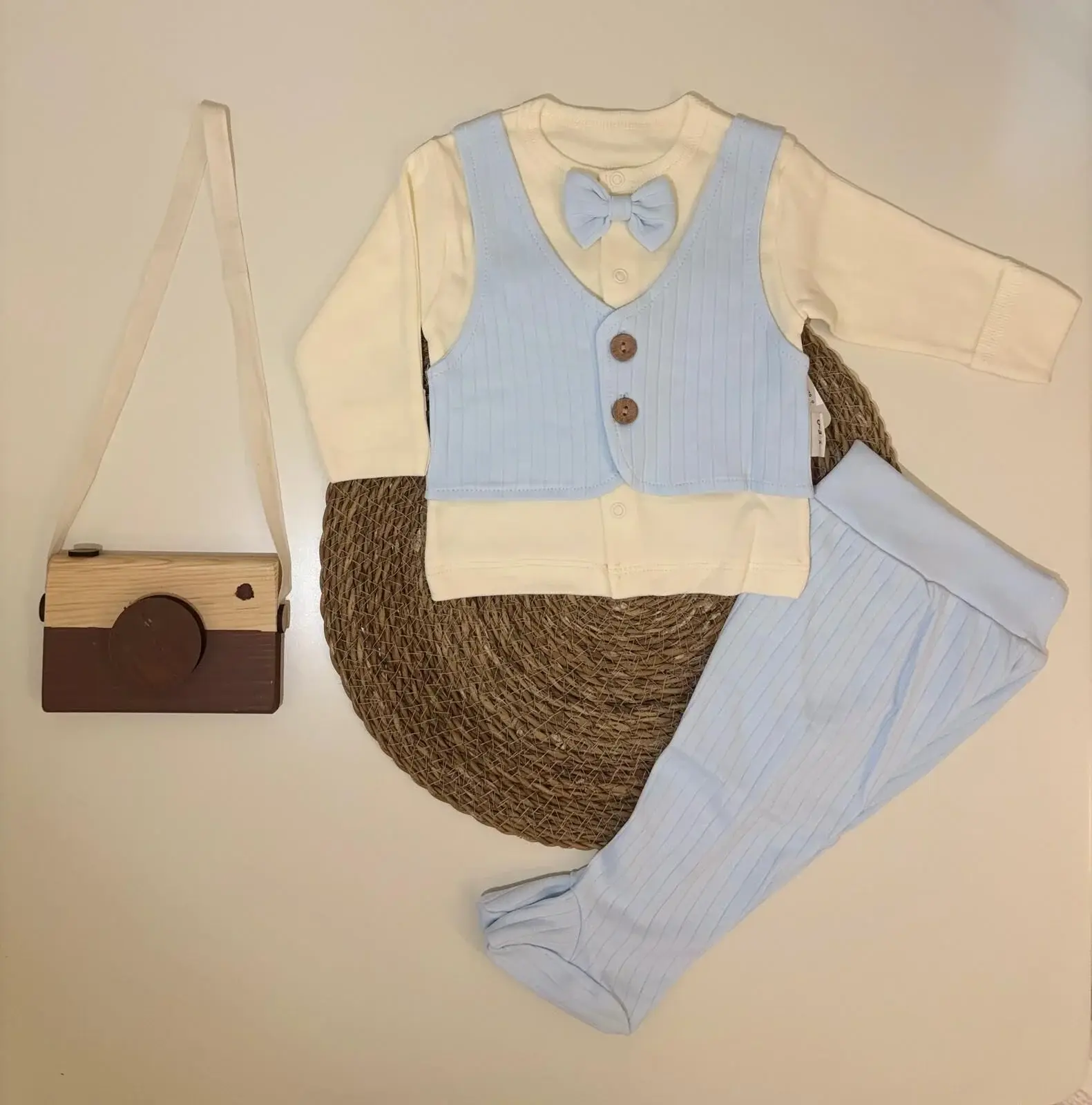 Yelekli Erkek 3’Lü Zıbın Takım, minik beylerin hem günlük kullanımda hem özel günlerde rahatlıkla giyebileceği şık ve konforlu bir settir. Set içinde bulunan uzun kollu zıbın, mavi ribana yelek ve aynı kumaştan patikli pantolon bir araya gelerek kusursuz bir uyum oluşturur. Üzerindeki ahşap düğme detayları ve sevimli papyon, bebeğinize tatlı bir şıklık kazandırır. Yumuşacık pamuklu dokusu sayesinde cildi asla tahriş etmez, nefes alan yapısıyla gün boyu rahatlık sağlar. Hem fotoğraf çekimleri hem aile ziyaretleri hem de özel kutlamalar için ideal olan Yelekli Erkek 3’Lü Zıbın Takım, annelerin favori tercihlerinden biridir.